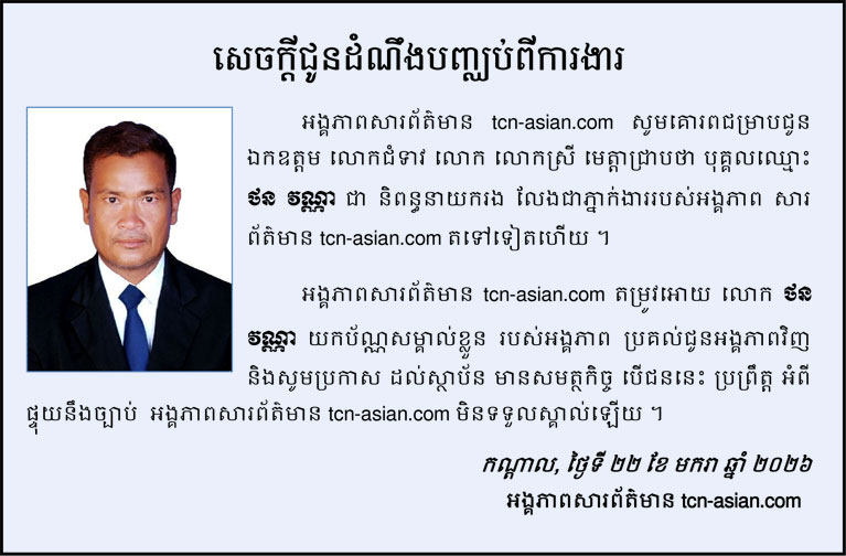 អង្គភាពសារព័ត៌មាន tcn-asian.com សូមជម្រាប ជូនដំណឹងបញ្ឈប់ លោក ថន វណ្ណា ពីភ្នាក់ងាររបស់អង្គភាព